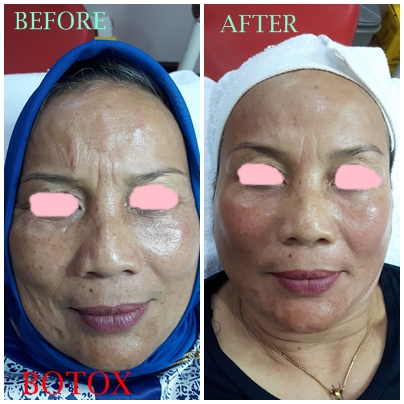 Botox adalah protein yang merelaksasi otot untuk mengurangi kerutan statis dan dinamis yaitu kerutan yang terbentuk ketika kita bergerak dan terjadi kontraksi otot (daerah sekitar mata, dahi, garis senyum, dll). Botox juga dapat meniruskan tulang rahang yang besar dan sagging face, serta untuk mengecilkan otot betis.